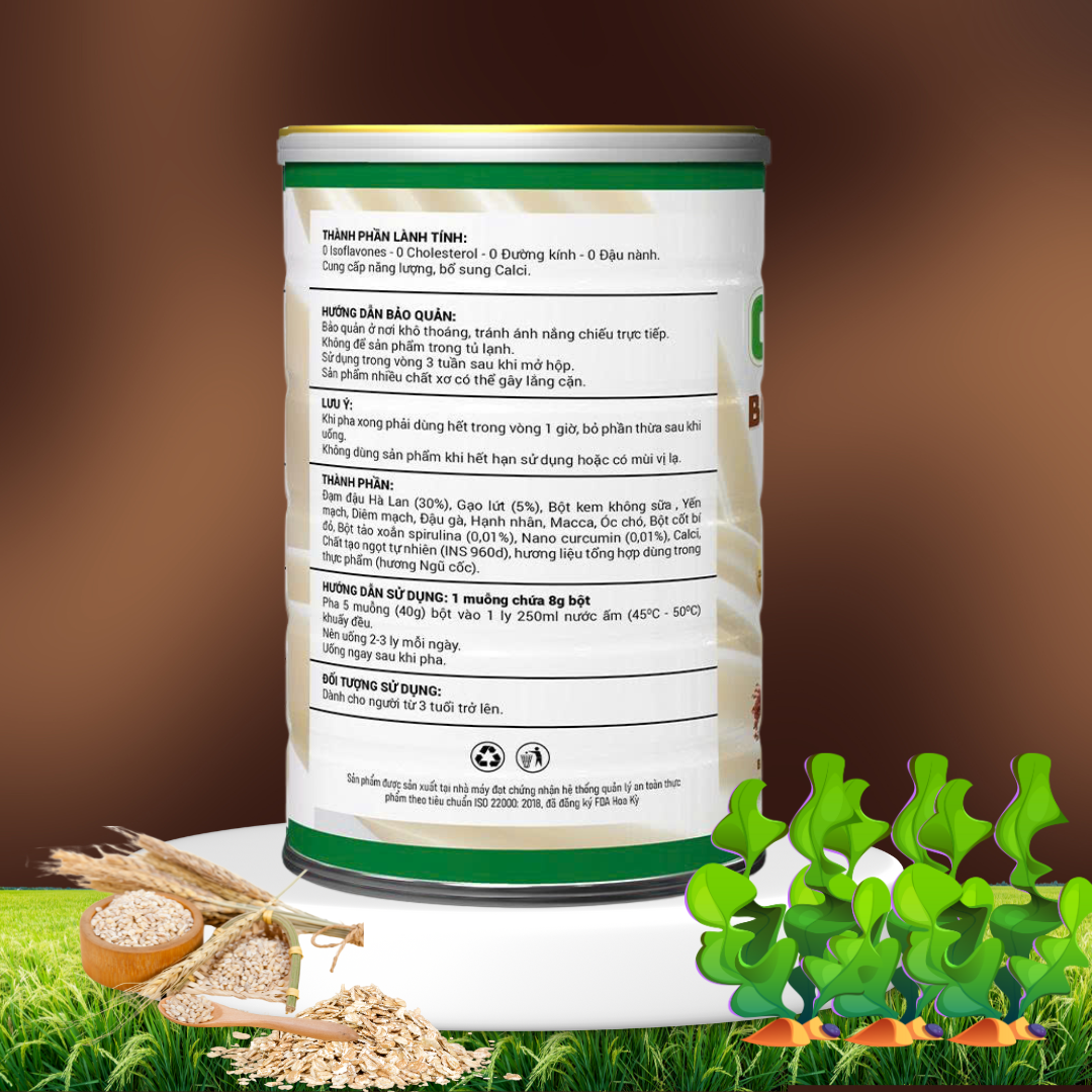 - Hỗn hợp Protein chiết xuất từ Đậu Hà Lan, Gạo Lứt, Yến Mạch… Diêm Mạch, Đậu Gà, Hạnh Nhân, Macca, Óc Chó, bột Cốt Bí Đỏ, Bột Tảo Xoắn Spirulia, Nano Curcumin, canxi…